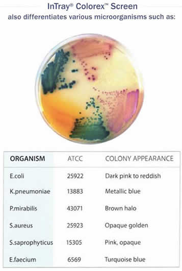 El Kit de Diagnostico Microbiologico para el Consultorio Intray Colorex Screen ha sido diseñado para un uso sencillo y rápido y NO requiere de equipos de laboratorio o envió de muestras a terceros. Su uso es para el Consultorio Veterinario. El Kit de Diagnostico Microbiologico Urinario Intray Colorex Screen es para un Aislamiento y diferenciación rápida de patógenos en el tracto urinario.